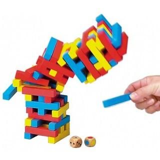 スリリングな積み上げゲーム。サイコロを振って、指定された色やマークをサイコロの目の数だけ抜いて上に積み上げていきます。崩れたら負け、ぬけるスティックがない時も負けです。他にも工夫次第で楽しみ方が広がります。